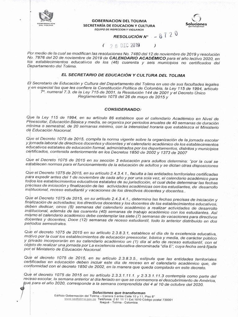 2019 de CALENDARIO ACADÉMICO para el año lectivo 2020, en los establecimientos educativos