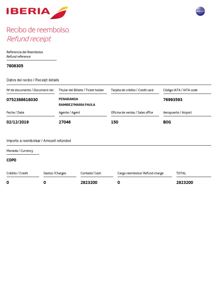 Nº de documento / Document nbr. Titular del Billete / Ticket holder Tarjeta de crédito / Credit card Código IATA / IATA code