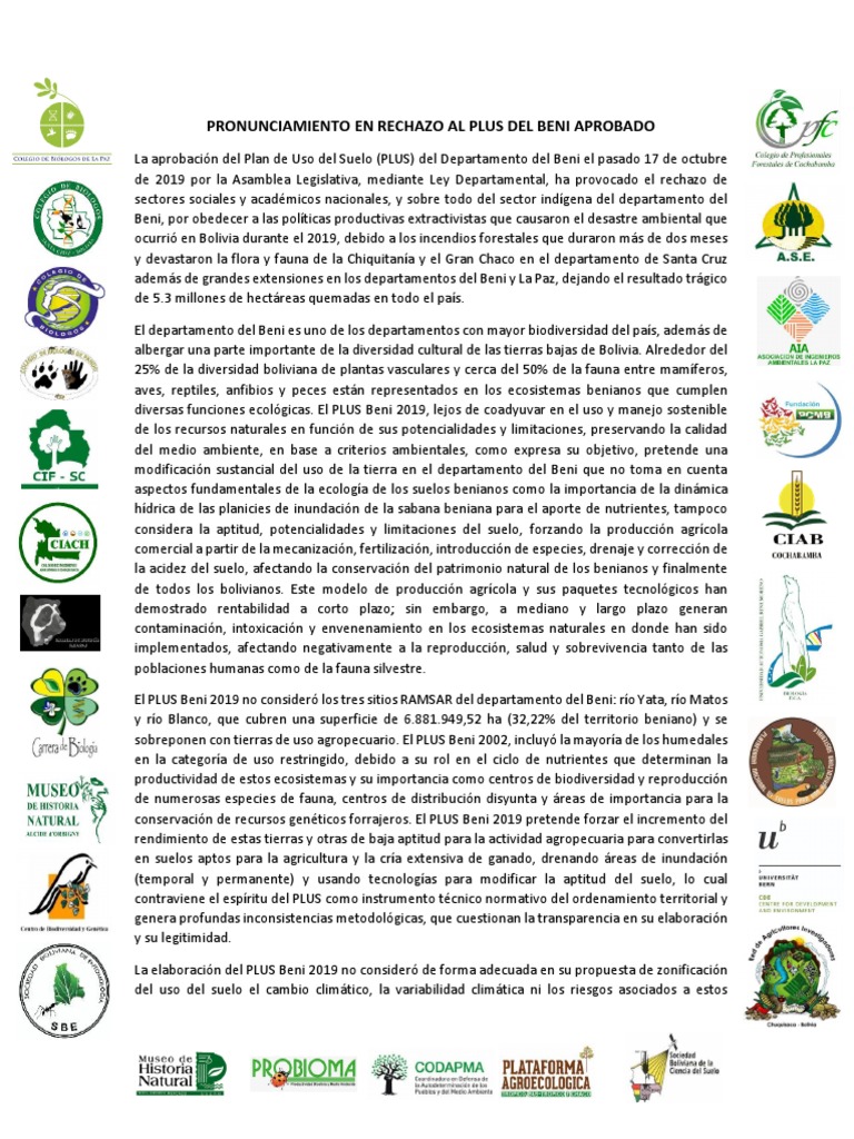 el PLUS Beni 2019 y se hayan pronunciado en contra de su aprobación, denunciando la falta de