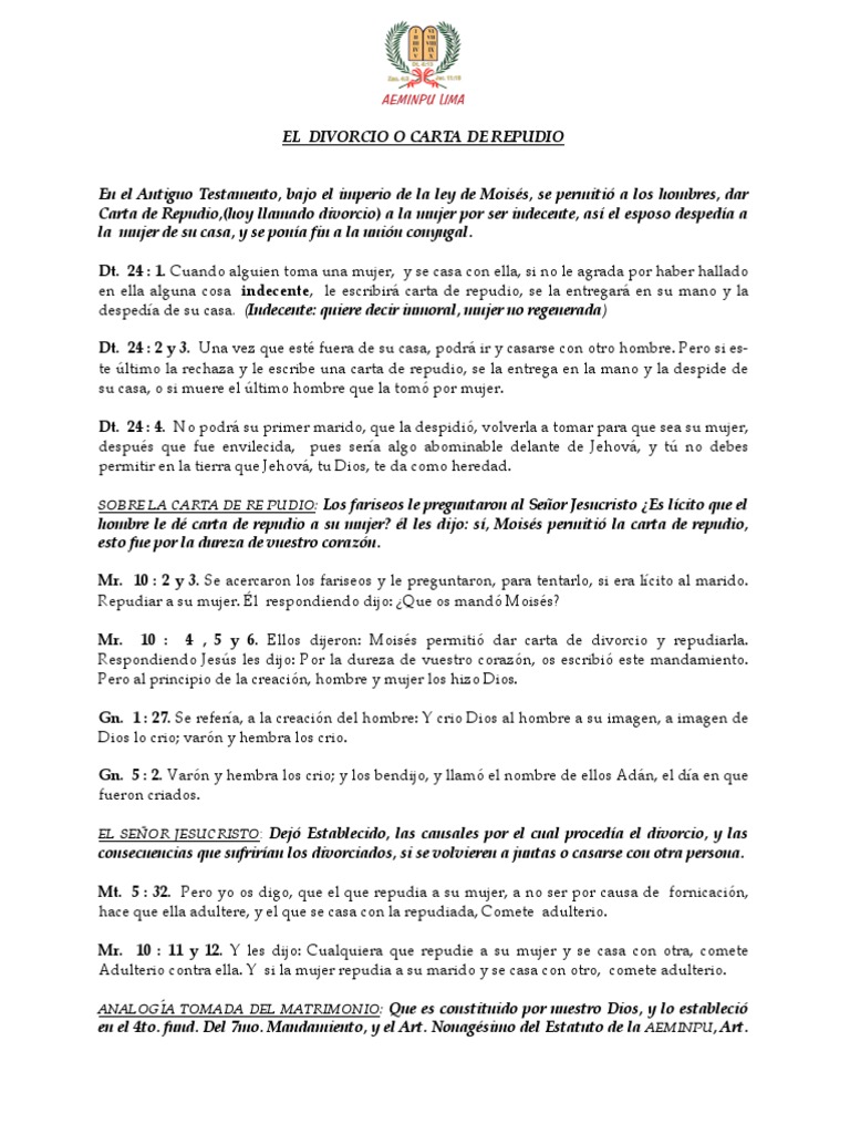 Dt. 24 : 1. Cuando alguien toma una mujer, y se casa con ella, si no le agrada por haber hallado