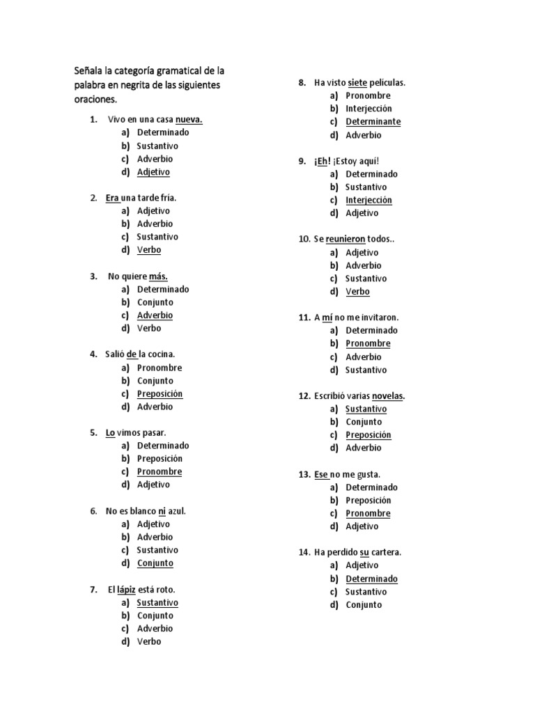 d) Verbo a) Adjetivo