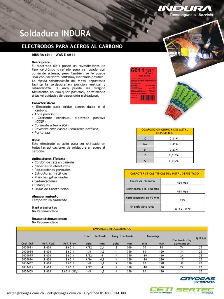 El electrodo 6011 es apto para soldar aceros al carbono en todas las posiciones. Tiene un revestimiento celulósico que permite una rápida solidificación del metal depositado para soldadura en posición vertical u horizontal. Se puede usar con corriente alterna o continua para aplicaciones como reparaciones, estructuras metálicas, cañerías y construcción.