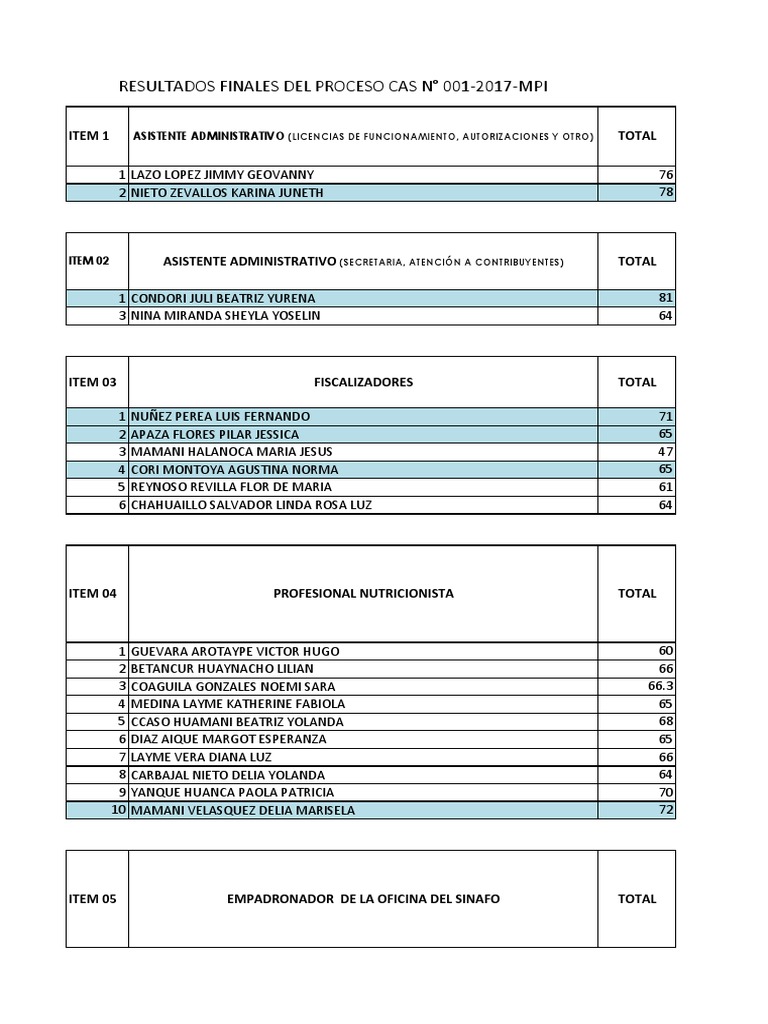 RESULTADOS FINALES DEL PROCESO CAS N° 001-2017-MPI
