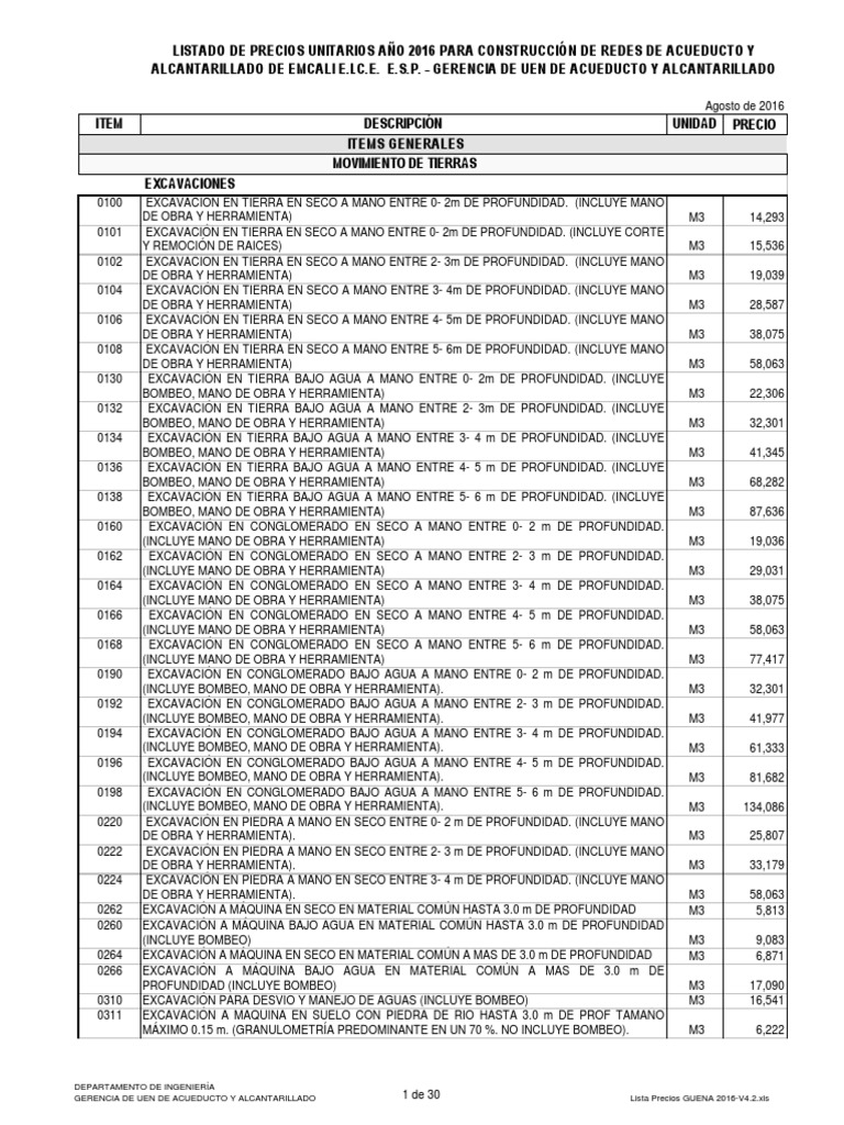 LISTADO DE PRECIOS UNITARIOS AÑO 2016 PARA CONSTRUCCIÓN DE REDES DE ACUEDUCTO Y