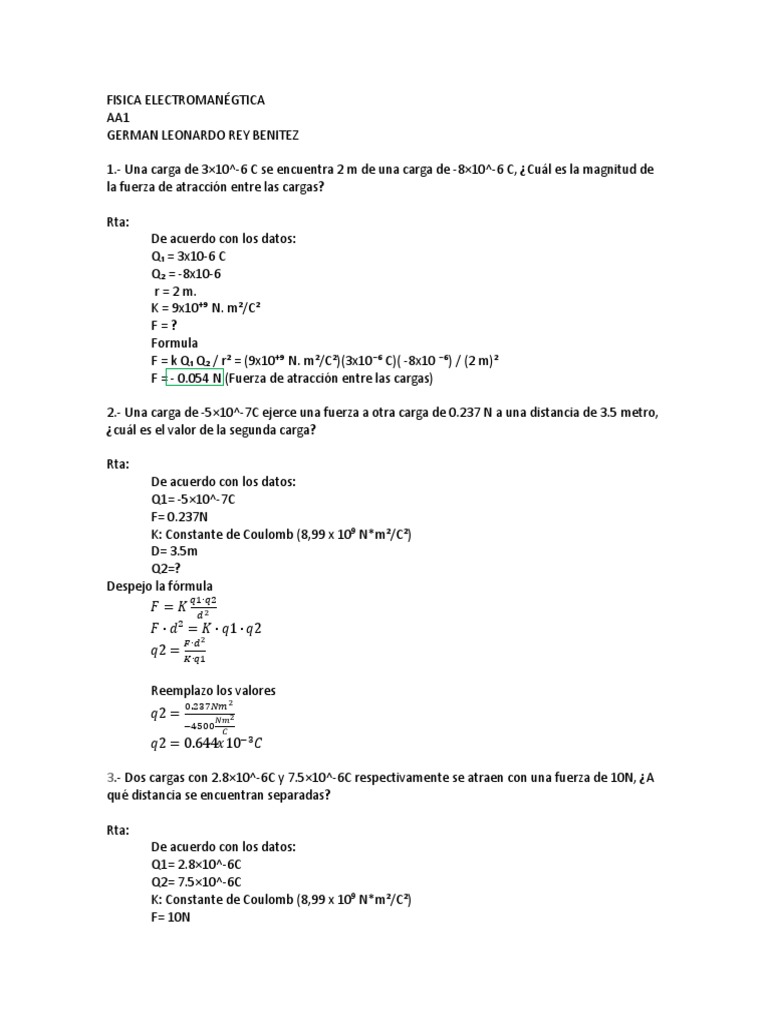 1.- Una carga de 3×10^-6 C se encuentra 2 m de una carga de -8×10^-6 C, ¿Cuál es la magnitud de