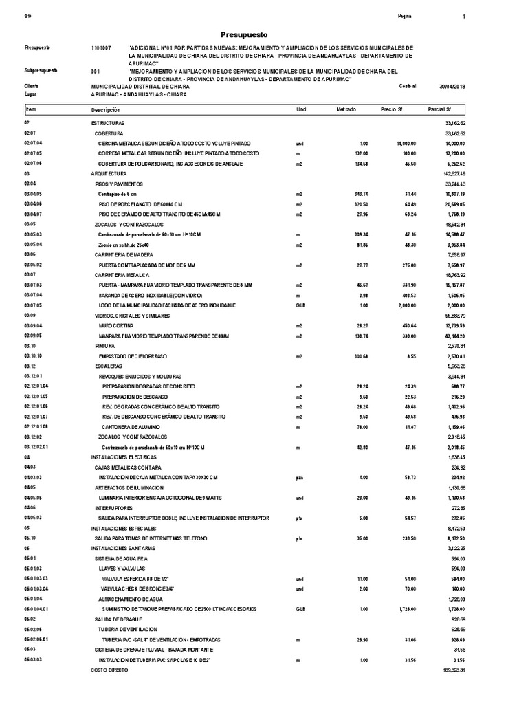 Presupuesto 1101007 "ADICIONAL N°01 POR PARTIDAS NUEVAS: MEJORAMIENTO Y AMPLIACION DE LOS SERVICIOS MUNICIPALES DE