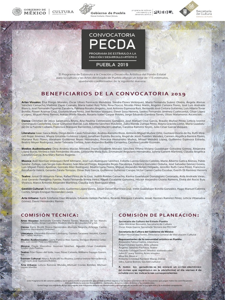 para la Cultura y las Artes del Estado de Puebla otorga un total de 115 estímulos,