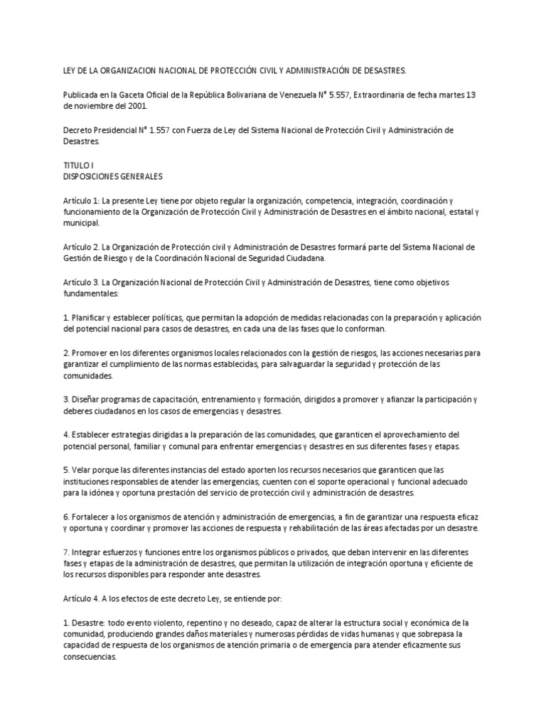 Decreto Presidencial N° 1.557 con Fuerza de Ley del Sistema Nacional de Protección Civil y Administración de