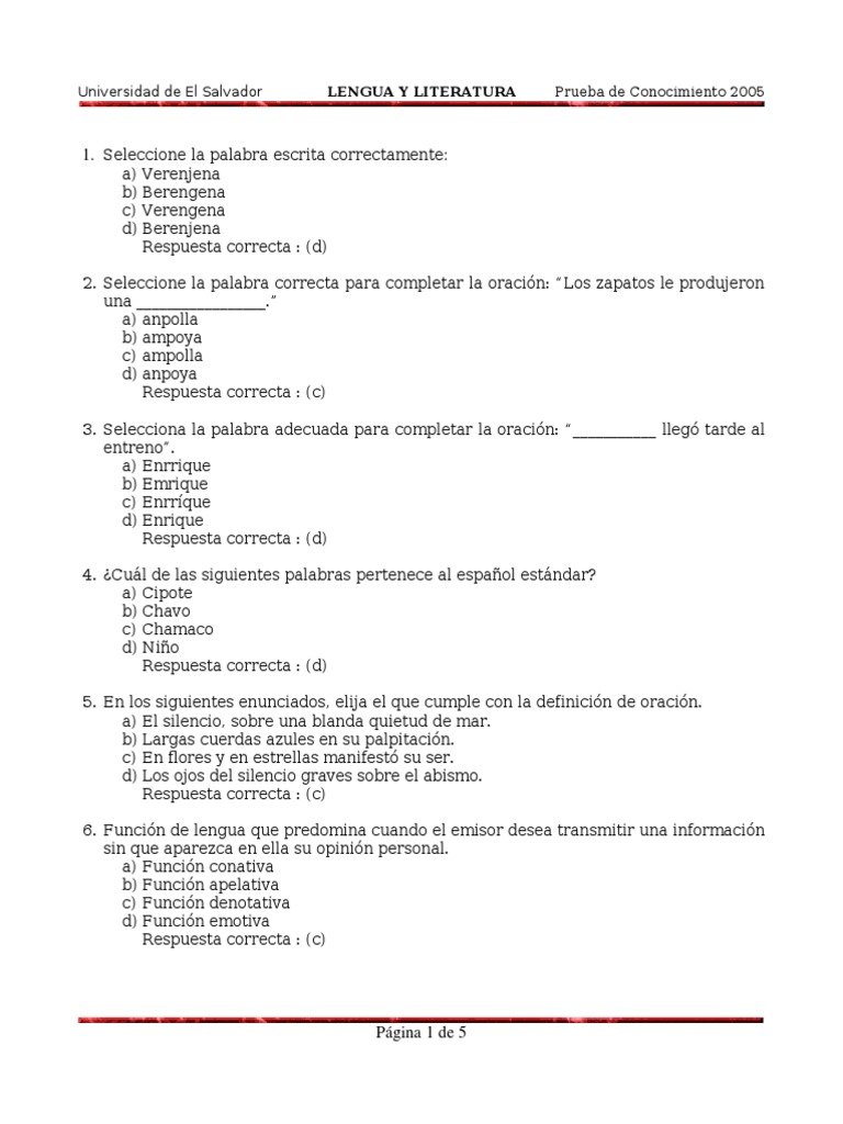 Universidad de El Salvador LENGUA Y LITERATURA Prueba de Conocimiento 2005