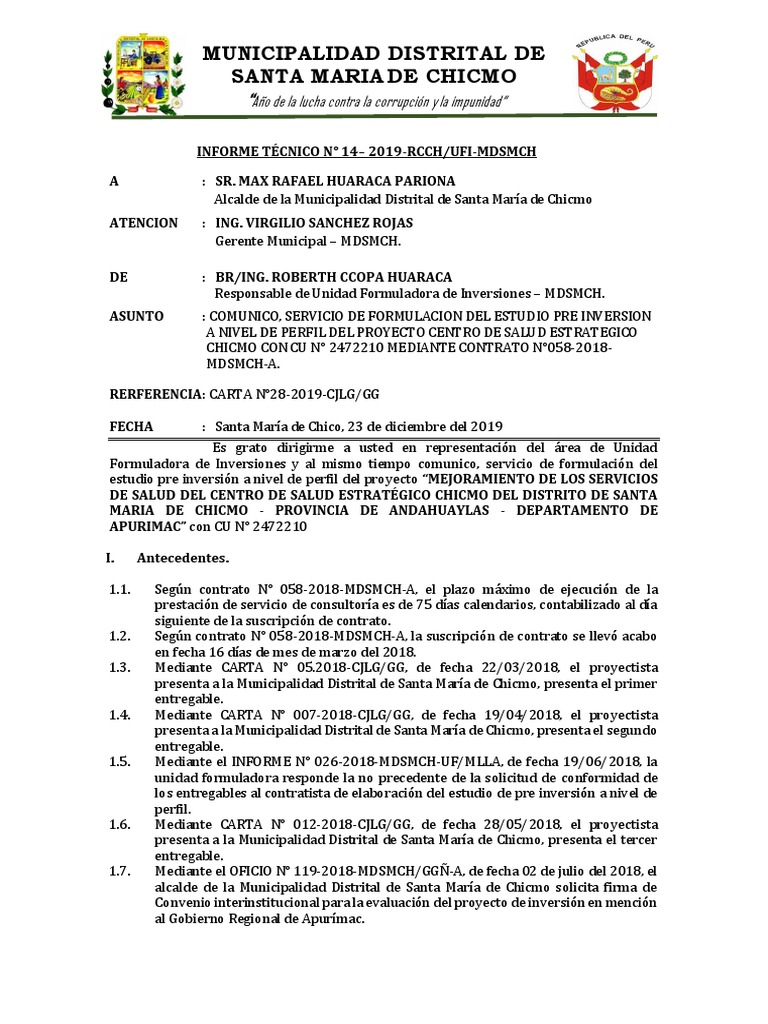 INFORME TÉCNICO N° 14– 2019-RCCH/UFI-MDSMCH