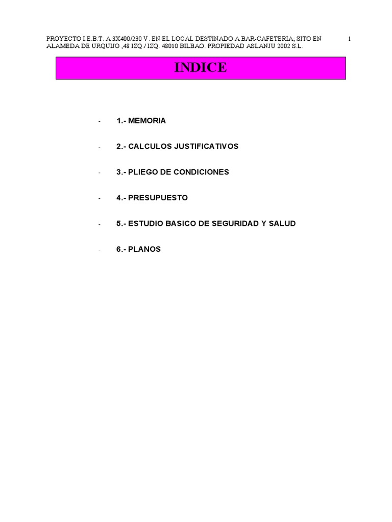 PROYECTO I.E.B.T. A 3X400/230 V. EN EL LOCAL DESTINADO A BAR-CAFETERIA; SITO EN 2