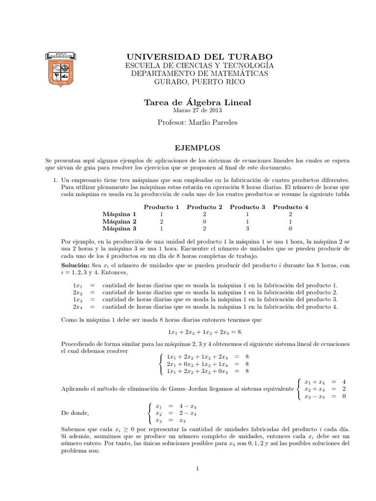 Procediendo de forma similar para las máquinas 2, 3 y 4 obtenemos el siguiente sistema lineal de ecuaciones