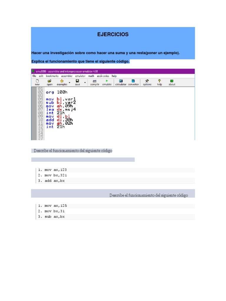 Hacer una investigación sobre como hacer una suma y una resta(poner un ejemplo).