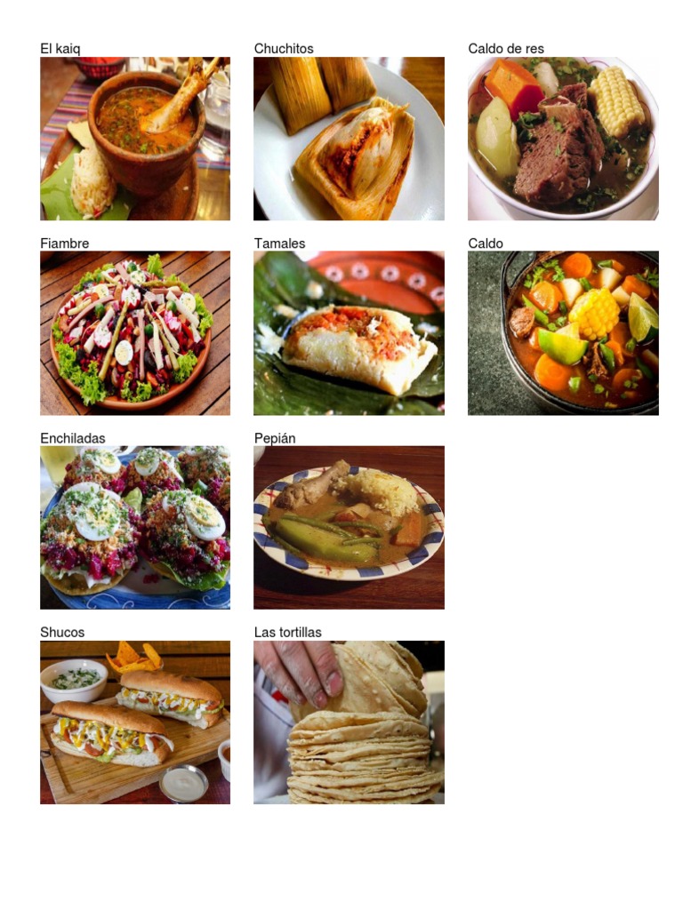 Este documento menciona varios platillos típicos mexicanos como el kaiq, chuchitos, caldo de res, fiambre, tamales, enchiladas, pepián, shucos y tortillas.