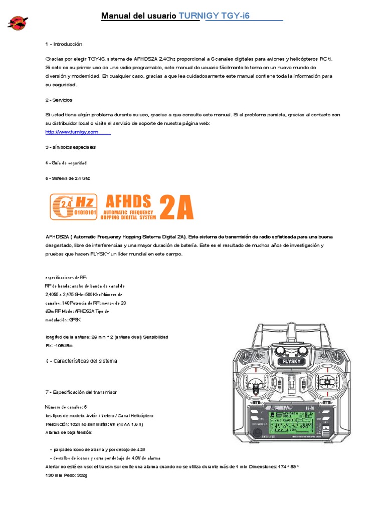 Gracias por elegir TGY-i6, sistema de AFHDS2A 2.4Ghz proporcional a 6 canales digitales para aviones y helicópteros RC ti.