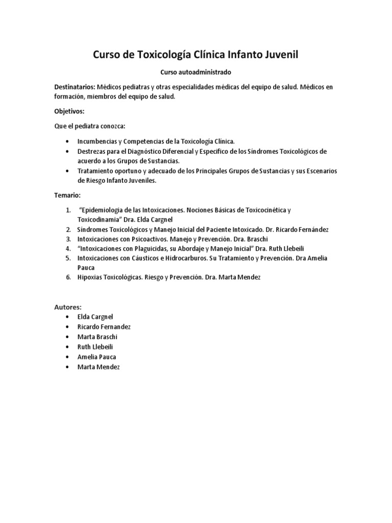 1. “Epidemiologia de las Intoxicaciones. Nociones Básicas de Toxicocinética y