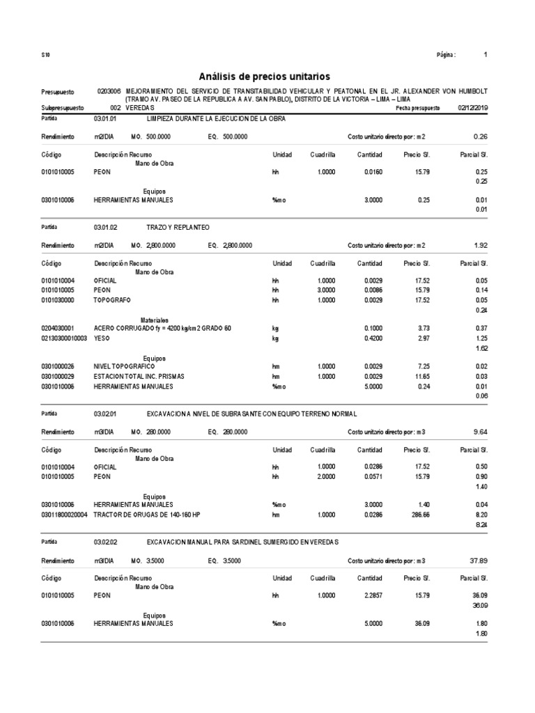 Código Descripción Recurso Unidad Cuadrilla Cantidad Precio S/. Parcial S/.