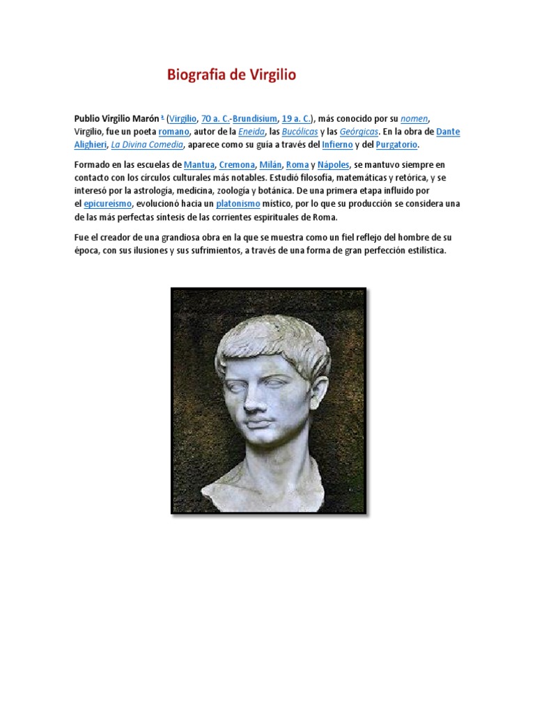 Virgilio, fue un poeta romano, autor de la Eneida, las Bucólicas y las Geórgicas. En la obra de Dante