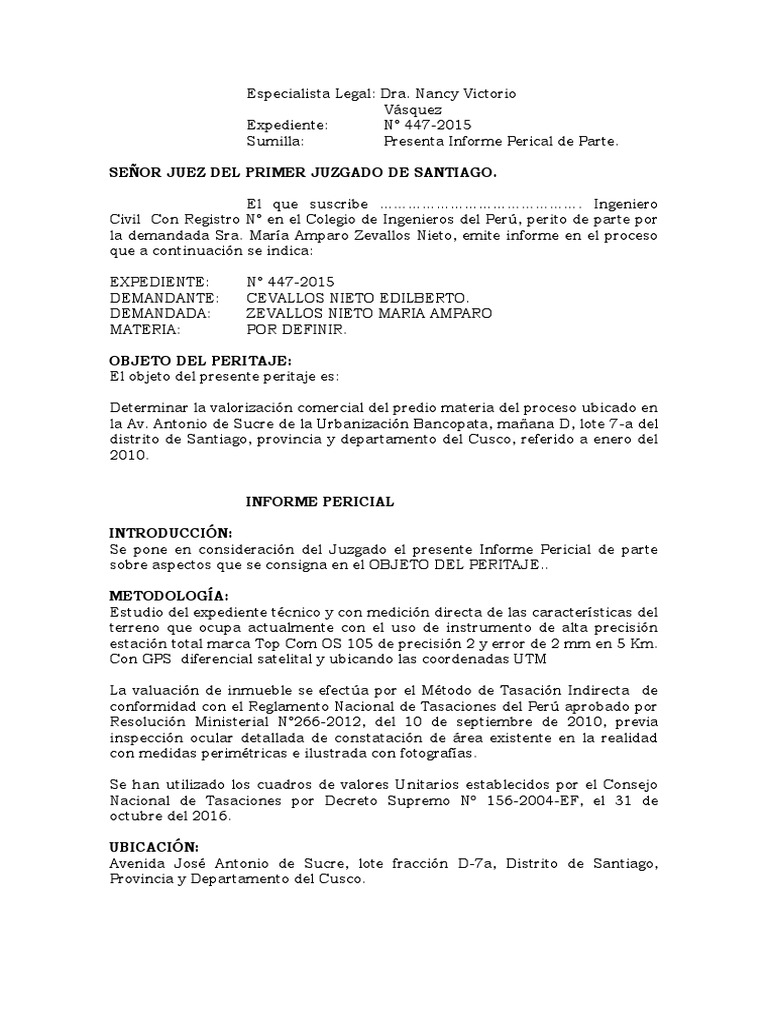 sobre aspectos que se consigna en el OBJETO DEL PERITAJE..