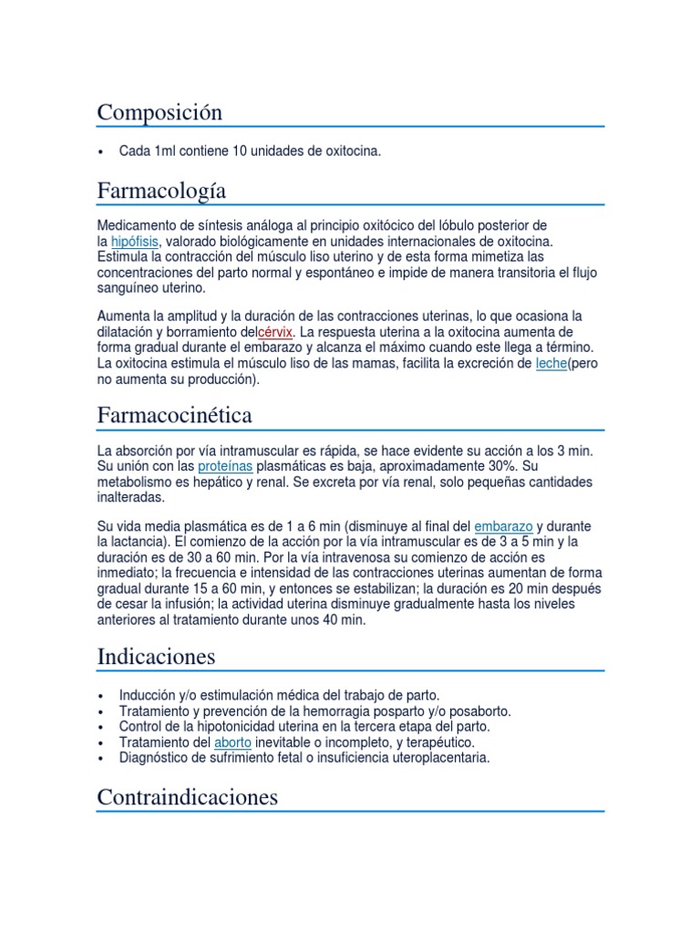 Hipersensibilidad a oxitocina. En parto vaginal cualquier condición que contraindique