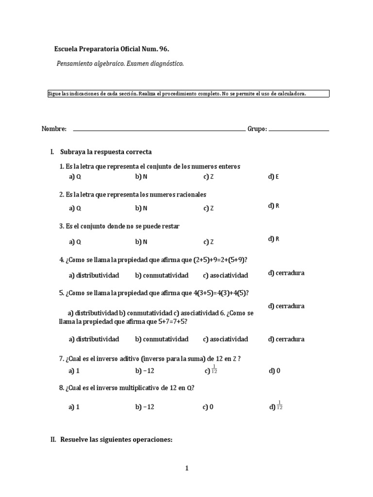Pensamiento algebraico. Examen diagnóstico.