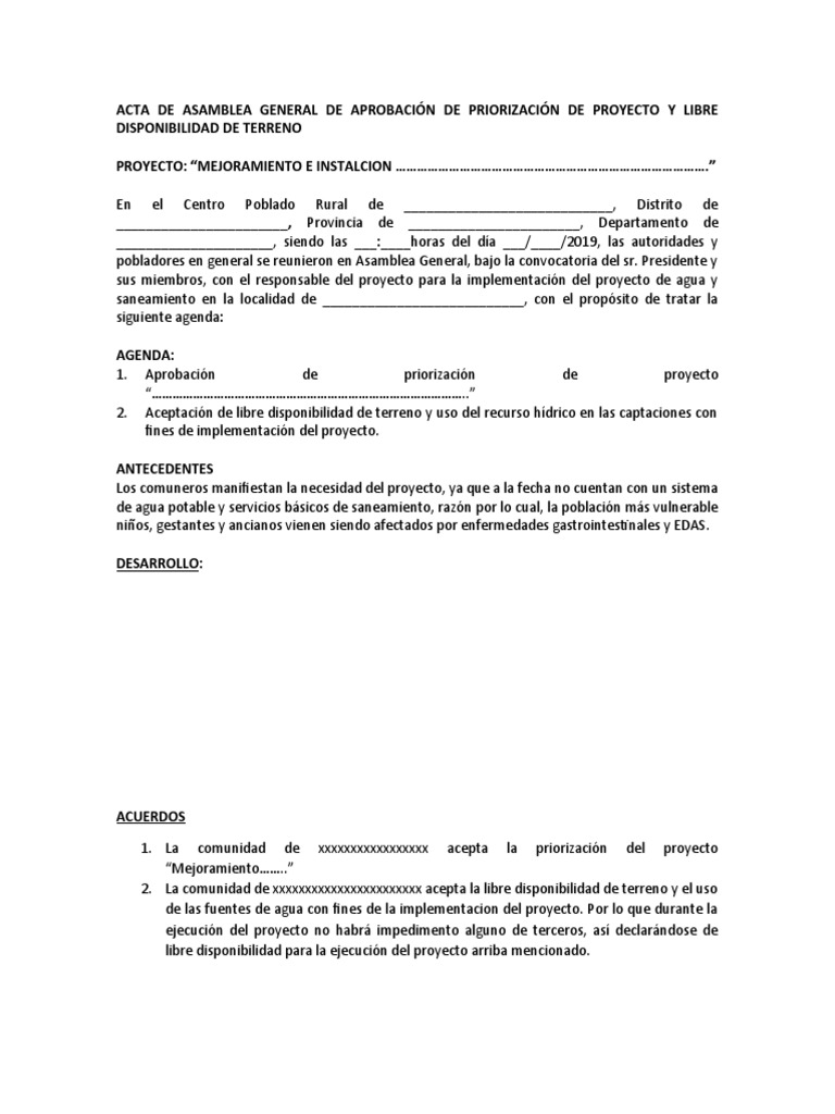 ACTA DE ASAMBLEA GENERAL DE APROBACIÓN DE PRIORIZACIÓN DE PROYECTO Y LIBRE