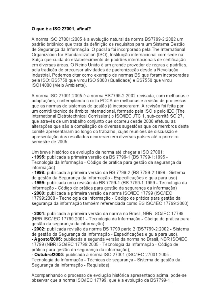 - Outubro/2005: publicada a norma ISO 27001 (ISO/IEC 27001:2005 -