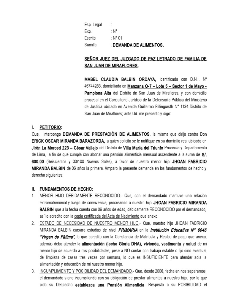 el demandado viene incumpliendo con su obligación de prestar alimentos a nuestro hijo, por lo que