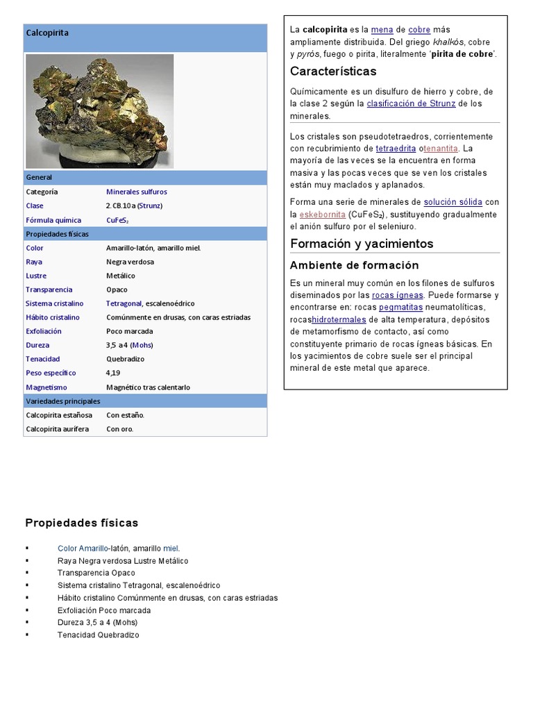 Filones de calcopirita. Montones de pirita de hierro cobriza. Cobre nativo. Filones de cobre gris.