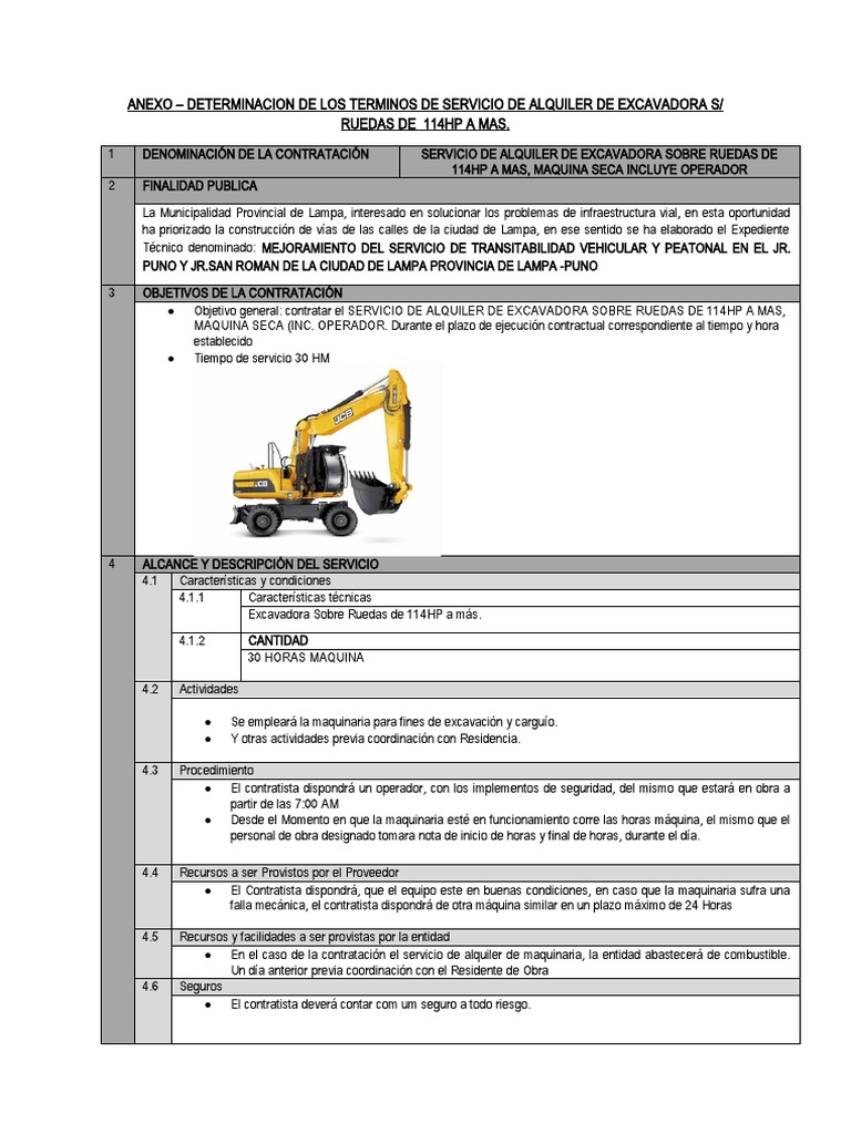 ANEXO – DETERMINACION DE LOS TERMINOS DE SERVICIO DE ALQUILER DE EXCAVADORA S/