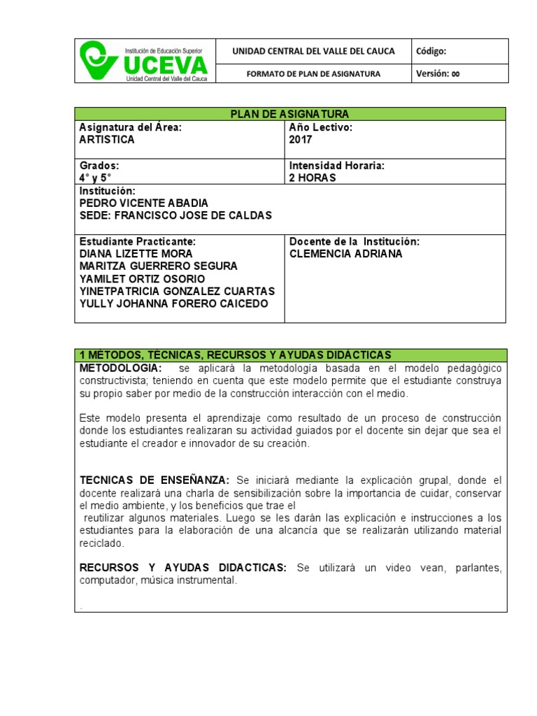 FORMATO DE PLAN DE ASIGNATURA Versión: 00