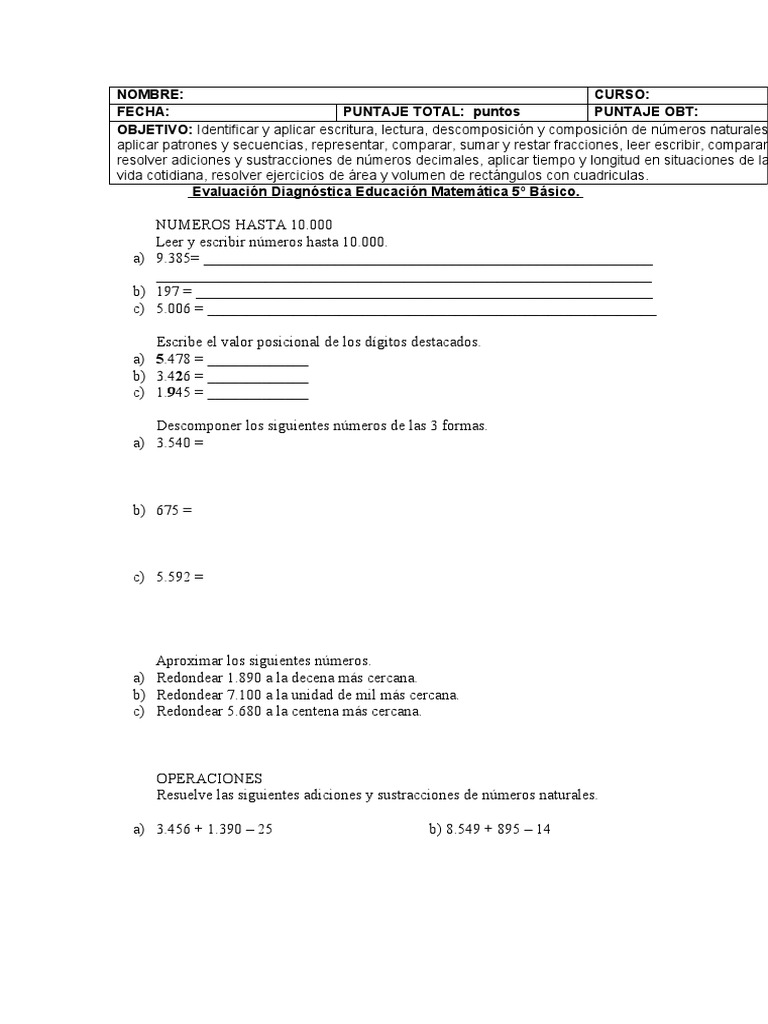 Evaluación Diagnóstica Educación Matemática 5º Básico.