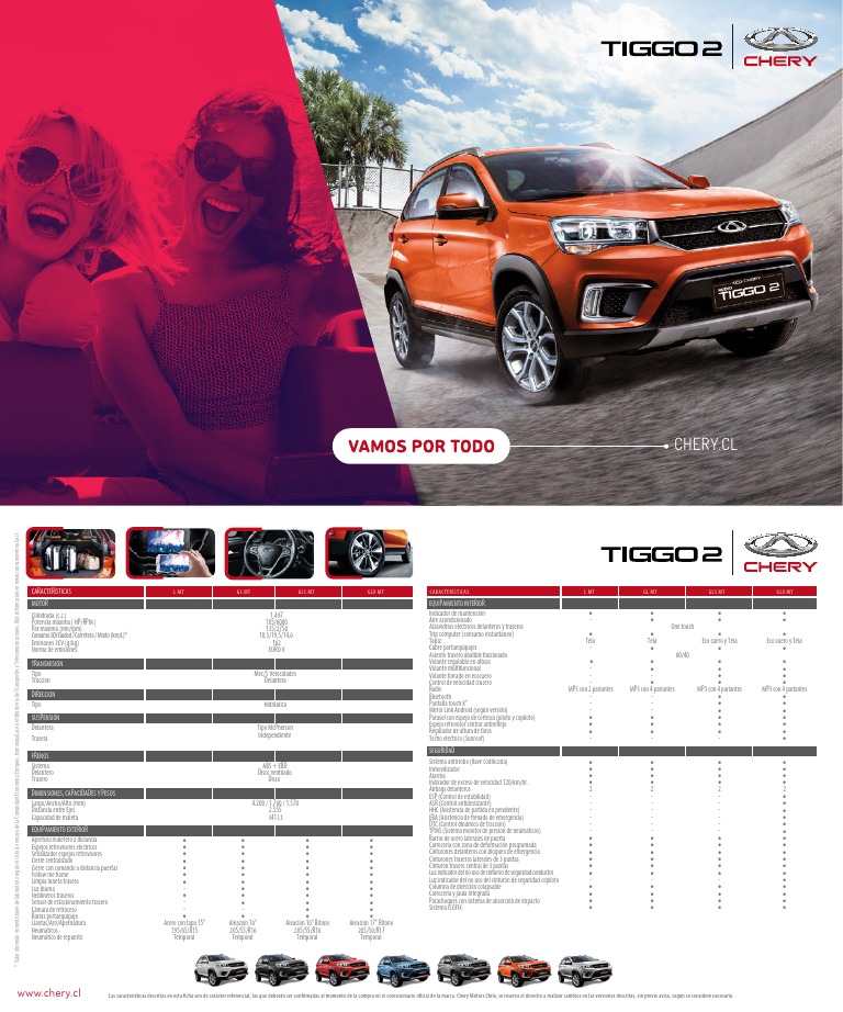 www.chery.cl Las características descritas en esta ficha son de carácter referencial, las que deberán ser confirmadas al momento de la compra en el concesionario oficial de la marca. Chery Motors Chile, se reserva el derecho a realizar cambios en las versiones descritas, sin previo aviso, según se considere necesario.