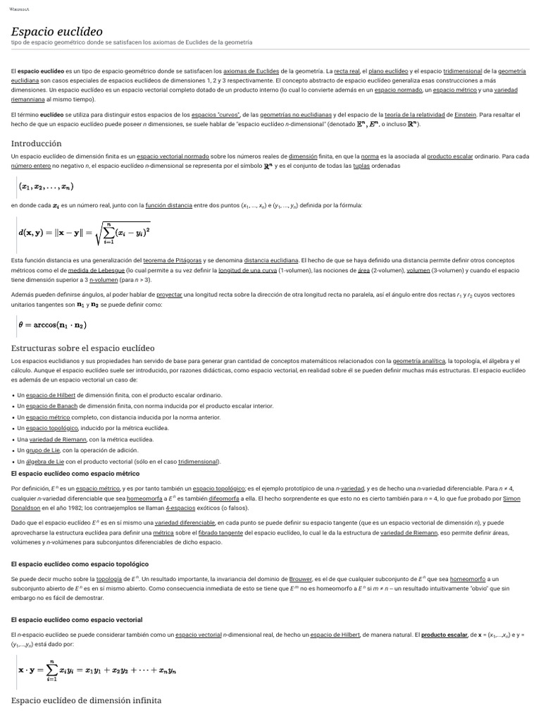 dimensiones. Un espacio euclídeo es un espacio vectorial completo dotado de un producto interno (lo cual lo convierte además en un espacio normado, un espacio métrico y una variedad