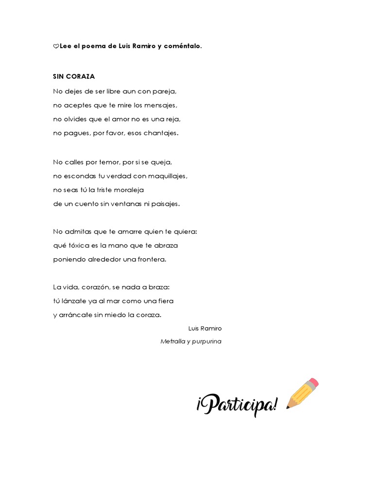 El poema habla sobre la importancia de mantener la libertad y la individualidad en una relación amorosa. Recomienda no permitir que la pareja controle los mensajes privados, no ocultar la verdad para evitar discusiones, y no aceptar que el amor romántico restrinja la autonomía personal. El poema concluye instando al lector a vivir la vida con valentía y sin miedos.