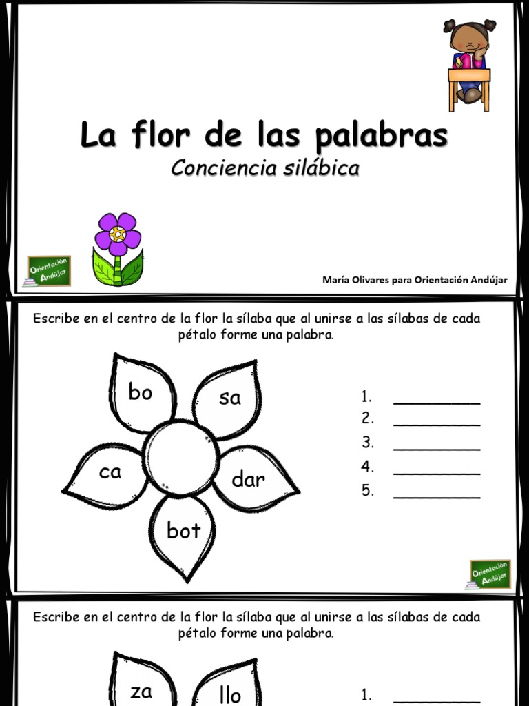 Escribe en el centro de la flor la sílaba que al unirse a las sílabas de cada