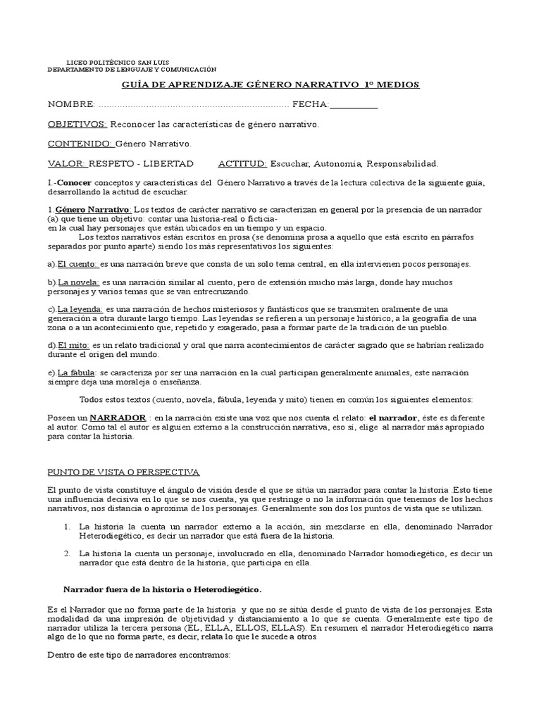GUÍA DE APRENDIZAJE GÉNERO NARRATIVO 1° MEDIOS