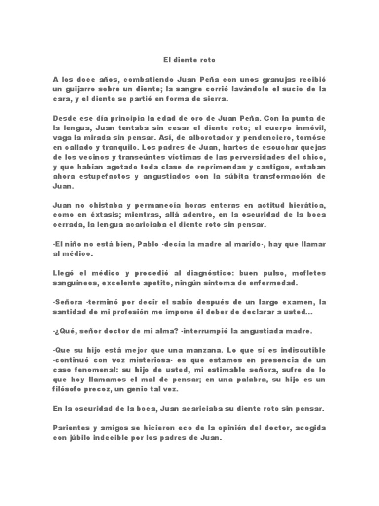 la lengua, Juan tentaba sin cesar el diente roto; el cuerpo inmóvil,