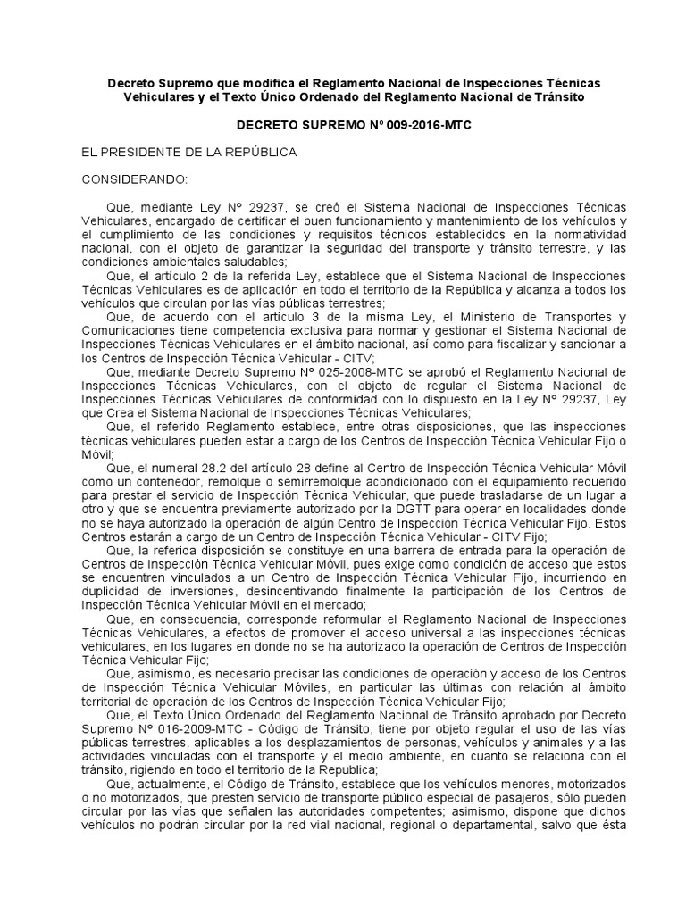 Decreto Supremo que modifica el Reglamento Nacional de Inspecciones Técnicas