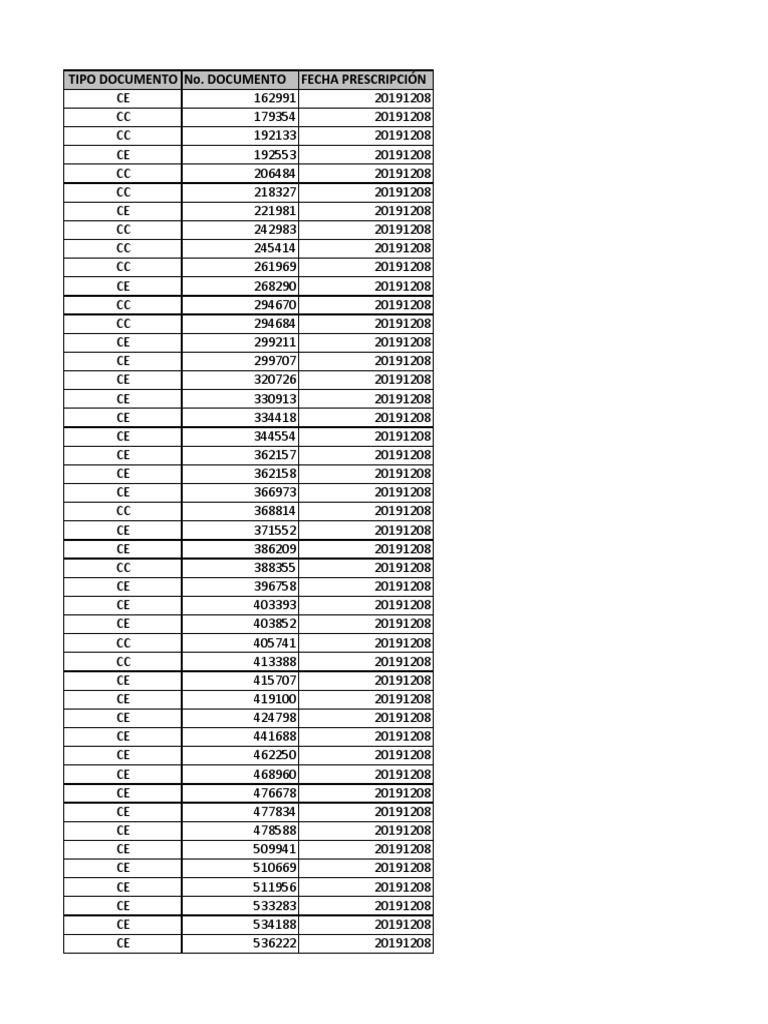 El documento contiene una lista de números de documento y sus fechas de prescripción correspondientes, todas del 8 de diciembre de 2019. La lista incluye cientos de entradas de números de documento que van desde 162991 hasta 5750678.