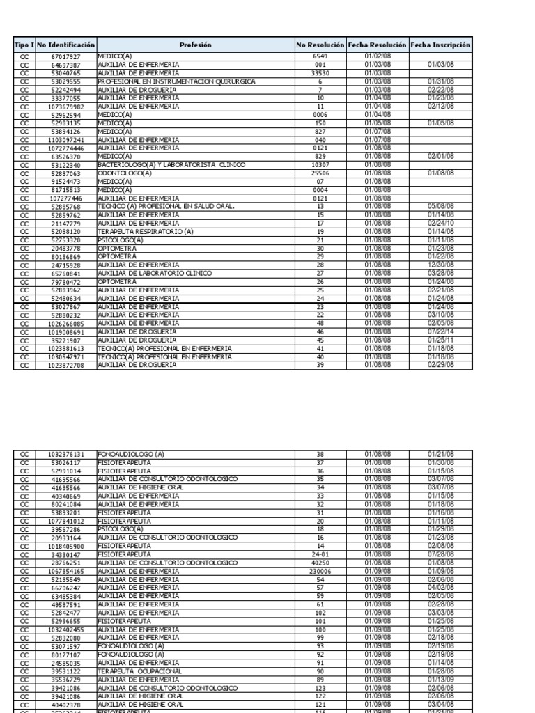 Tipo I No Identificación Profesión No Resolución Fecha Resolución Fecha Inscripción