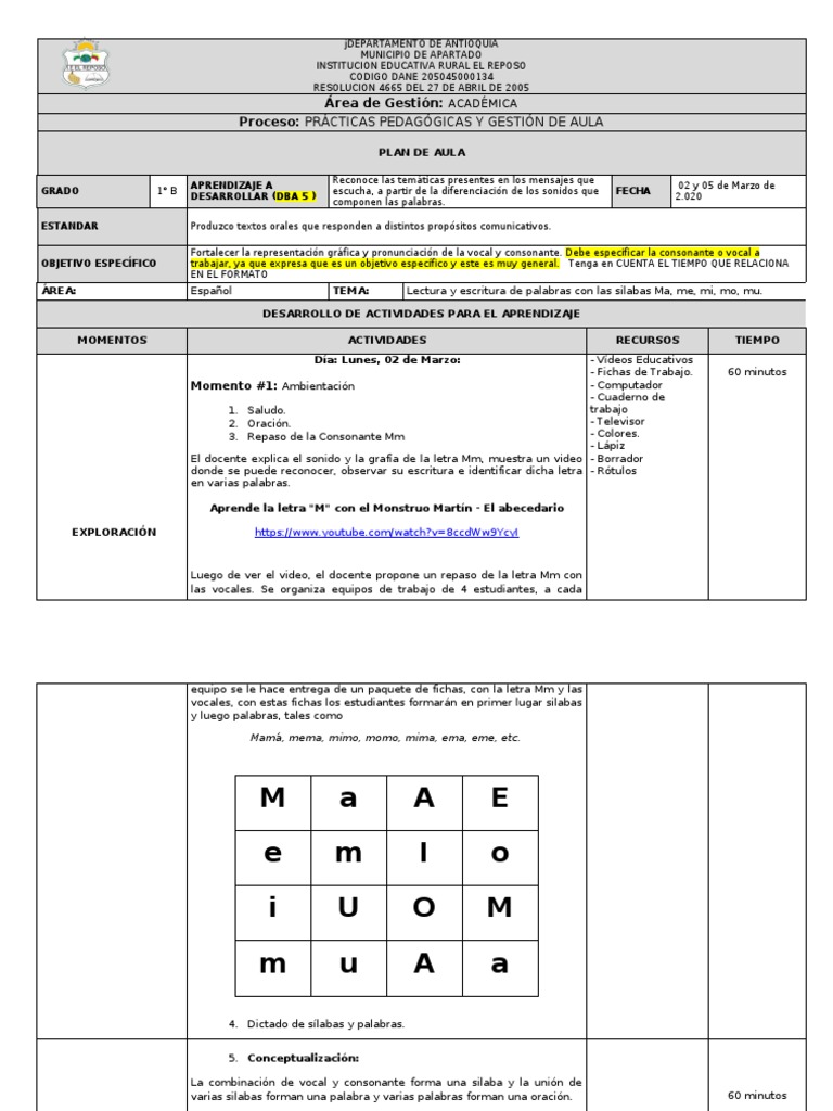 ÁREA: Español TEMA: Lectura y escritura de palabras con las silabas Ma, me, mi, mo, mu.