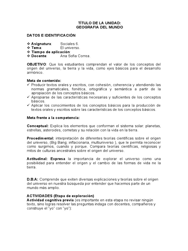 origen del universo, la tierra y la vida, como ejes básicos para el desarrollo
