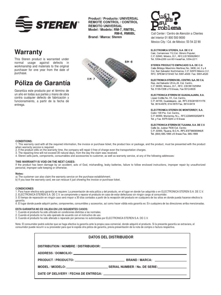 1. Para hacer efectiva esta garantía se requiere: La presentación de esta póliza y del producto, en el lugar en donde fue adquirido o en ELECTRONICA STEREN S.A. DE C.V.