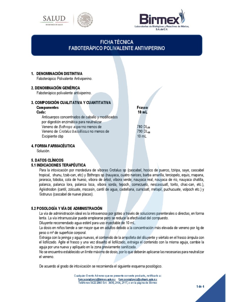 Para la intoxicación por mordedura de víboras Crotalus sp (cascabel, hocico de puerco, tziripa, saye, cascabel