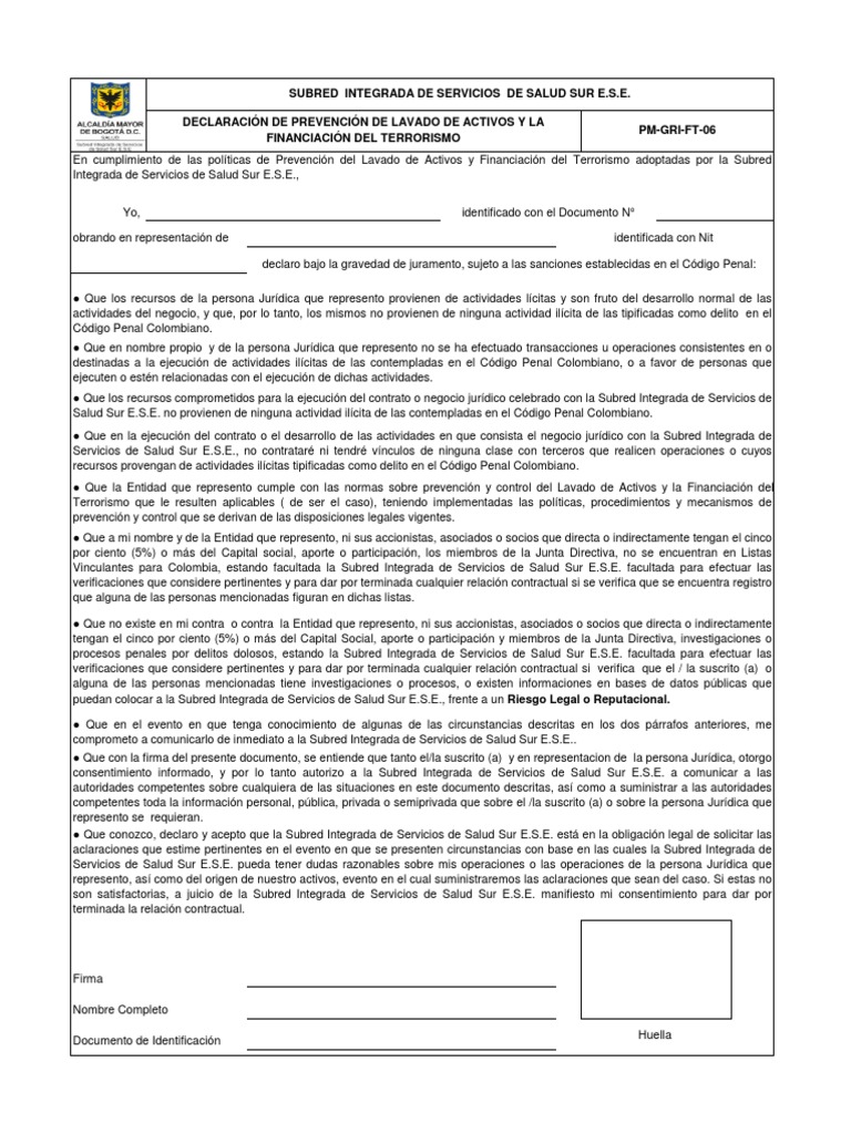 En cumplimiento de las políticas de Prevención del Lavado de Activos y Financiación del Terrorismo adoptadas por la Subred