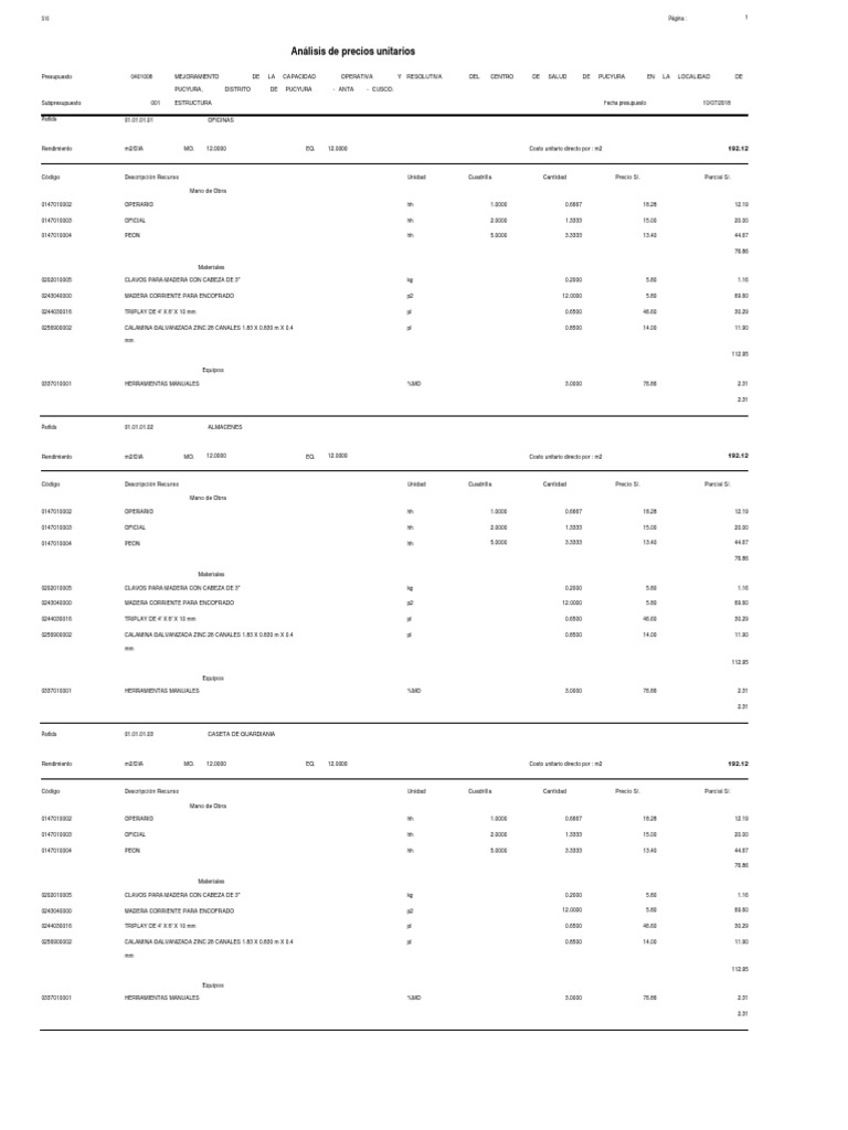 Código Descripción Recurso Unidad Cuadrilla Cantidad Precio S/. Parcial S/.