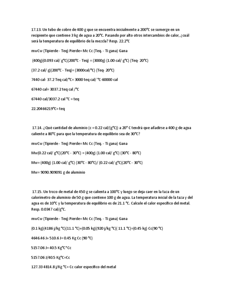 17.19. Un bloque de cobre de 1.3 kg se calienta a 200°C y luego se introduce en un recipiente