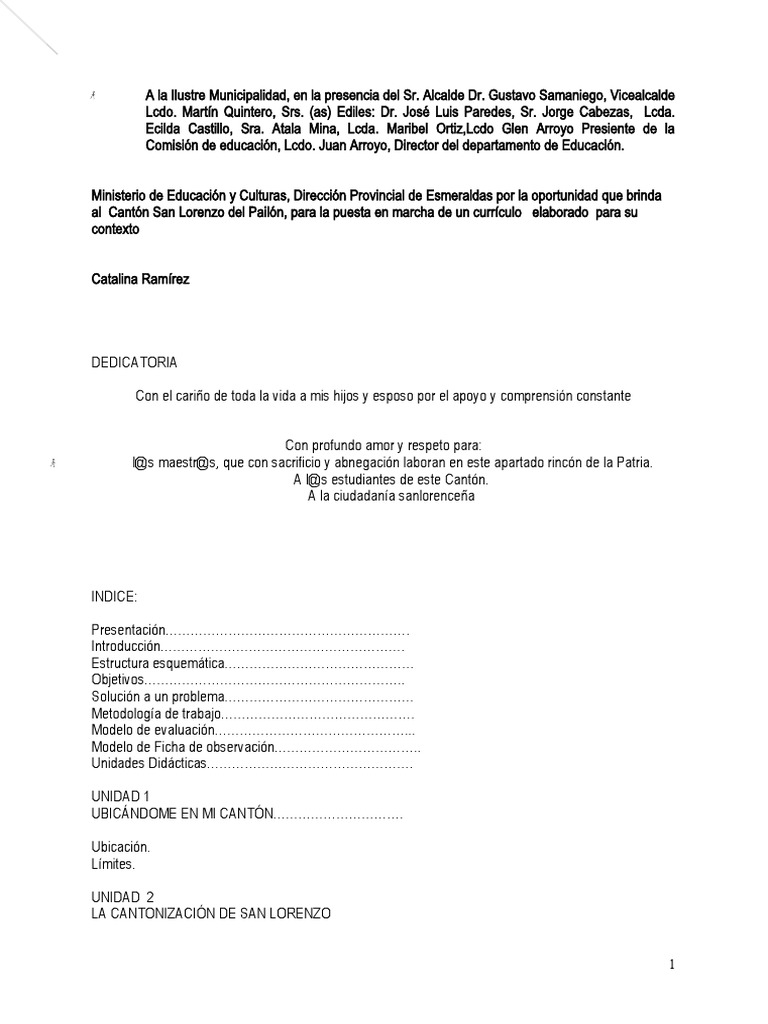 al Cantón San Lorenzo del Pailón, para la puesta en marcha de un currículo elaborado para su