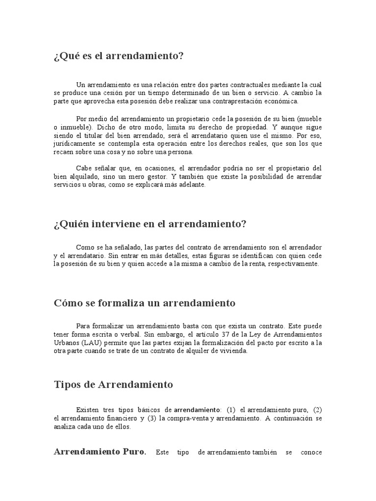Un arrendamiento es una relación entre dos partes contractuales mediante la cual